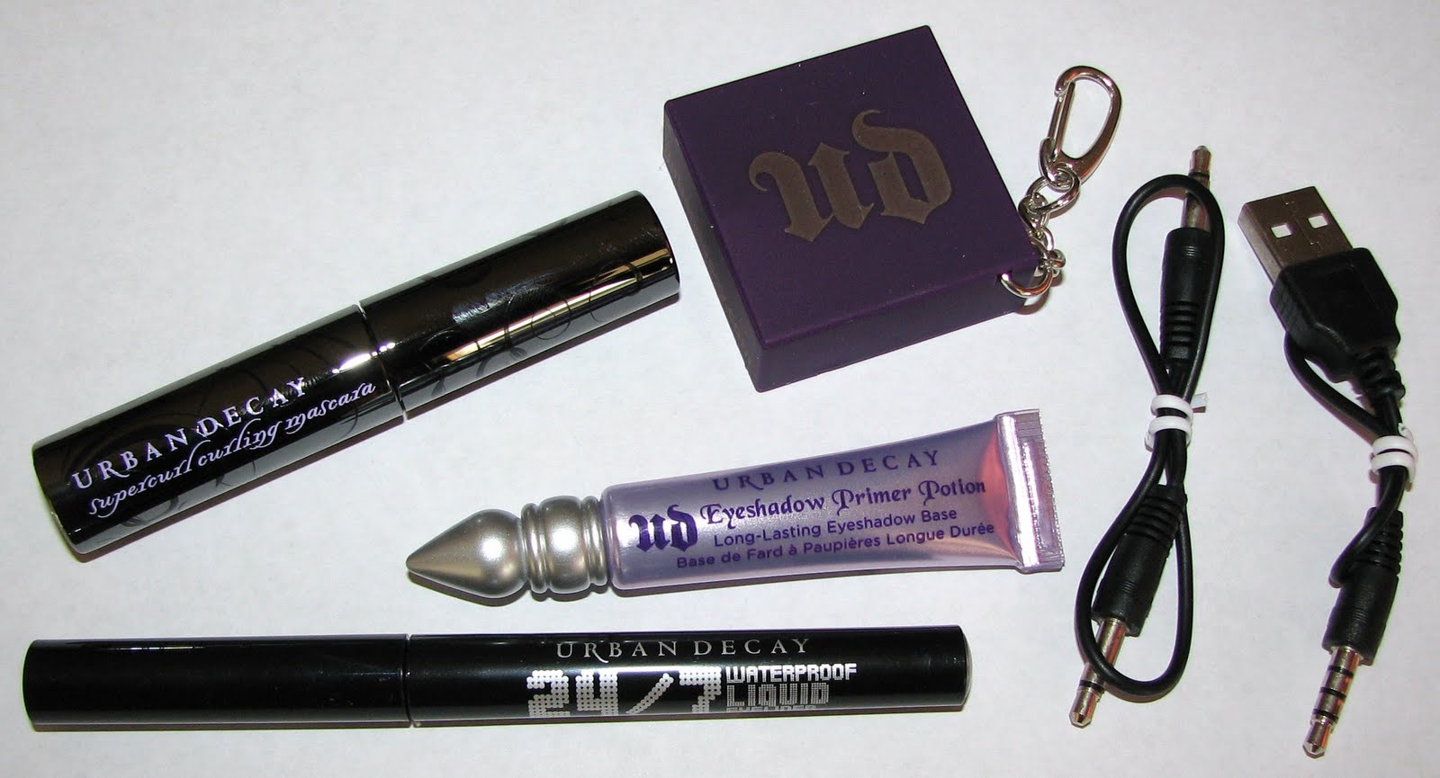 Bottom Tray featuring 16 eye shadows (10 are new!), Travel Size Original Primer Potion, Travel Size Super Curl Mascara, and a full size 24/7 Waterproof Liquid Liner in Perversion, a portable speaker, and cords for downloading:
